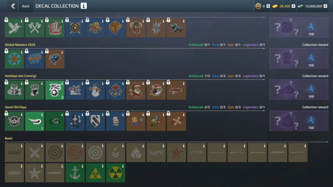 Decals are grouped into collections. A new decal collection is released with every game update. Once a player collects a full set of items from a collection, they can unlock an exclusive reusable legendary decal.