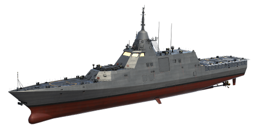 China's experimental multipurpose frigate, based on the Type 056 design. The ship boasts sleek design with maximized stealth capabilities. This project not only features highly modular equipment, that can be further tailored to specific naval scenarios, but also a unique hypervelocity cannon and custom torpedo launchers, as well as some powerful air defense systems. It can engage all types of targets in any weather conditions.