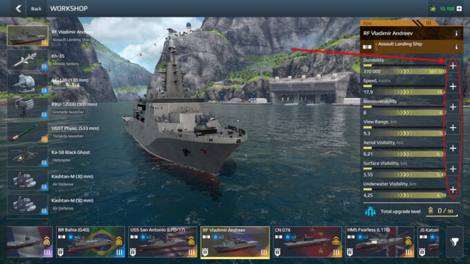 - Приоритет прокачки основных характеристик, таких как скорость, прочность корпуса, манёвренность, а также резерв авиации для вертолётов, бомбардировщиков и дронов.