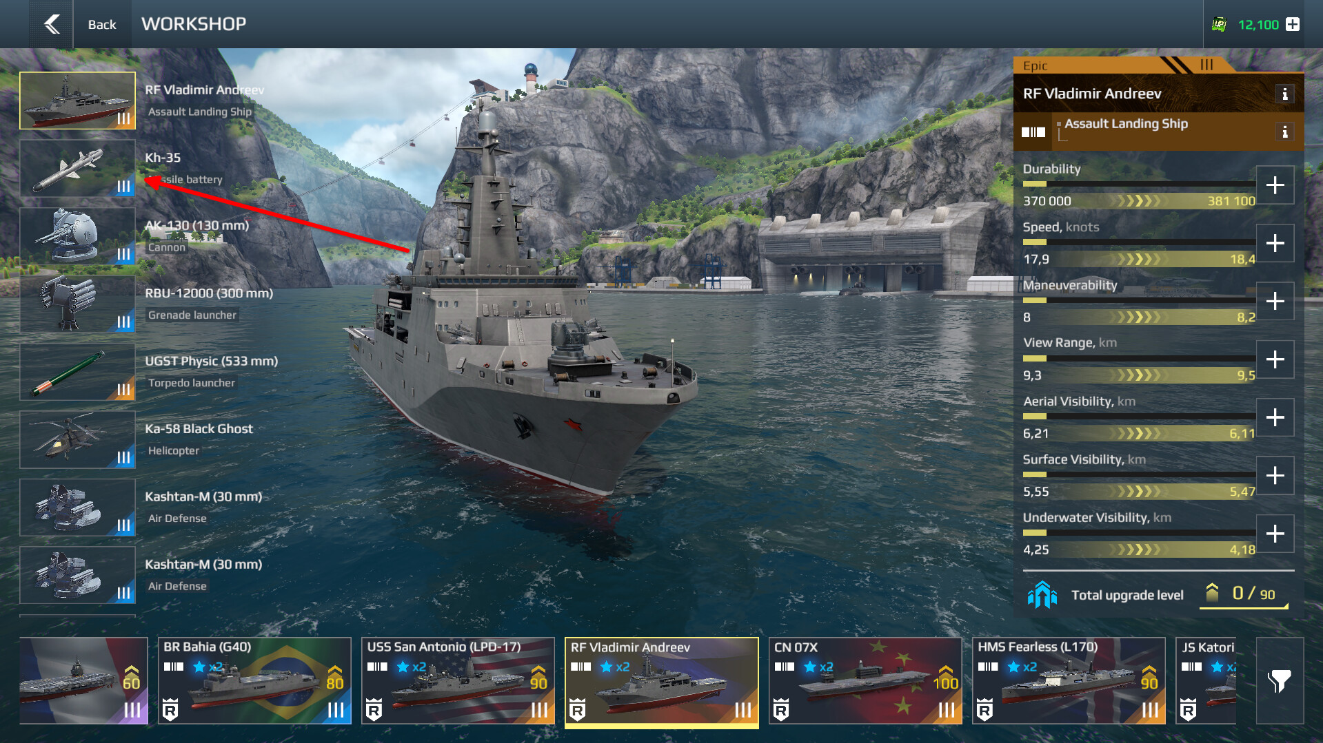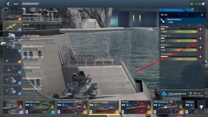 - Приоритетная последовательность улучшений: Вначале — характеристики корабля Затем — артиллерия, ракетное вооружение и торпеды После — защитные модули